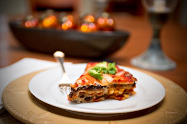 Eat your vegetables. If I’ve actually planned ahead, I’ll add chopped, sautéed onions and red (or green) bell pepper to the black beans. And ever since my friend Kim introduced me to her squash, onion and corn calabacitas, I make a double batch and include the leftovers in the corn layer. Once I even snuck in tofu. But please don’t tell my husband.