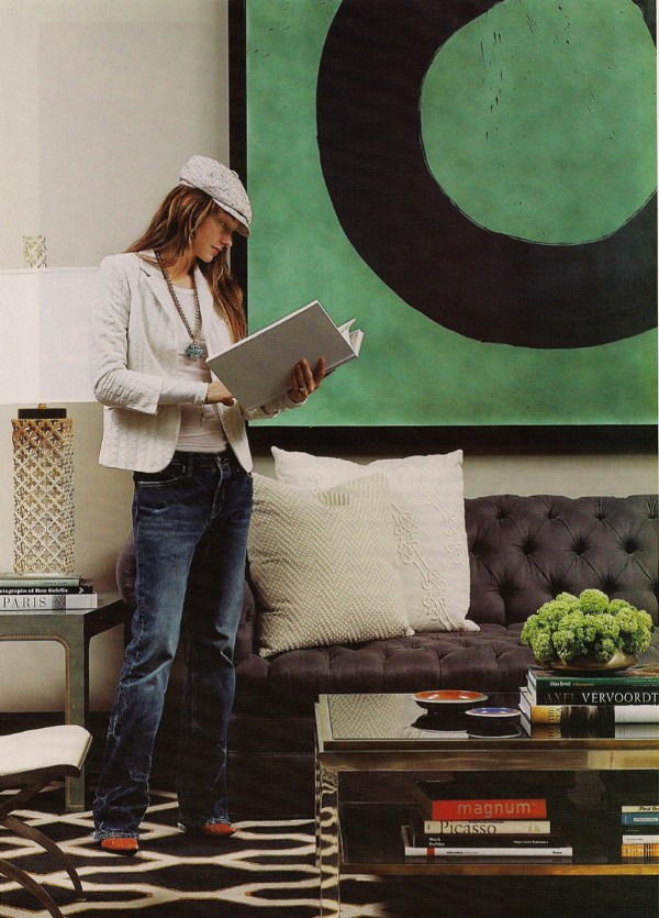 I love so many things about this room — the cool, silvery gray walls and Roman shade; the warm golds; the pops of green; the twig chandelier; the natural elements — all anchored by the fabulous (and huge!) abstract ensō painting. I clipped it almost nine years ago, but it still feels just as fresh and relevant today.